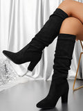 Botas altas para mujer diseñadas con una caña de altura media a alta y una silueta suavemente fruncida a lo largo de la pierna. El diseño presenta una punta ligeramente afilada, un tacón de bloque de altura media y una estructura definida que mantiene la forma. Acabadas con líneas de costura visibles que aportan un perfil limpio y equilibrado.