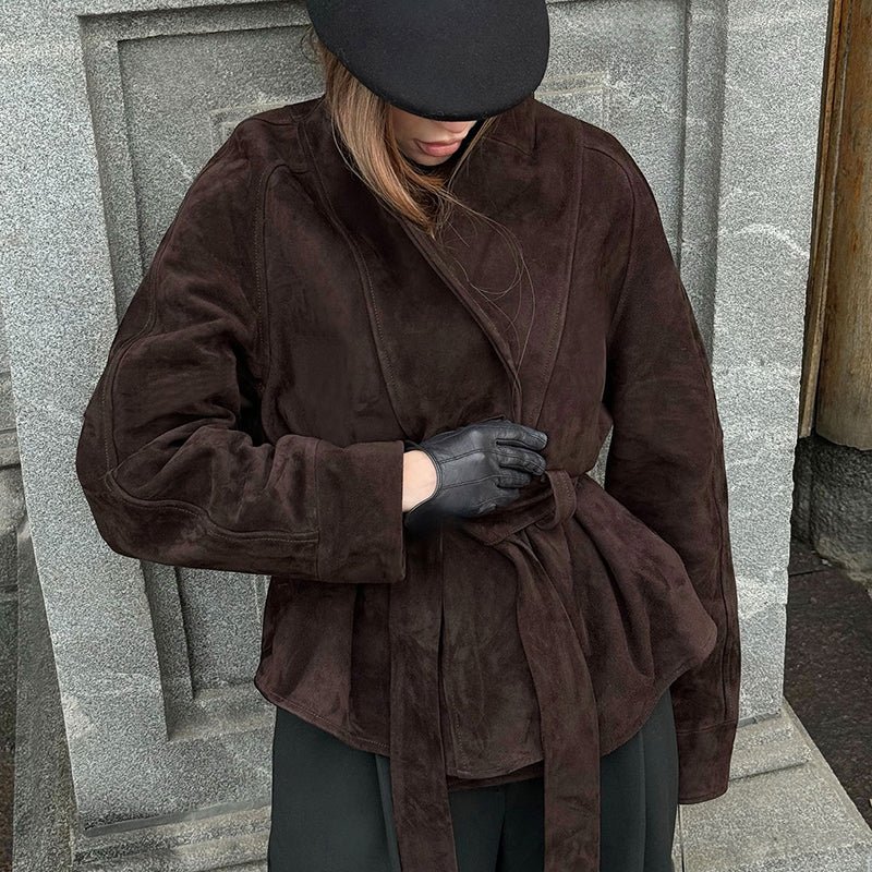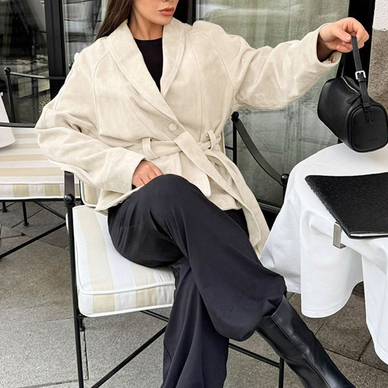 Diseño: Chaqueta cruzada con solapas, cinturón ajustable y mangas relajadas
