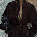 Con una silueta fluida y envolvente, esta chaqueta incorpora un diseño cruzado con cinturón ajustable que define la figura de forma elegante. Las solapas suaves y las mangas de línea amplia aportan un aire clásico y refinado, ideal tanto para el día a día como para ocasiones más cuidadas.