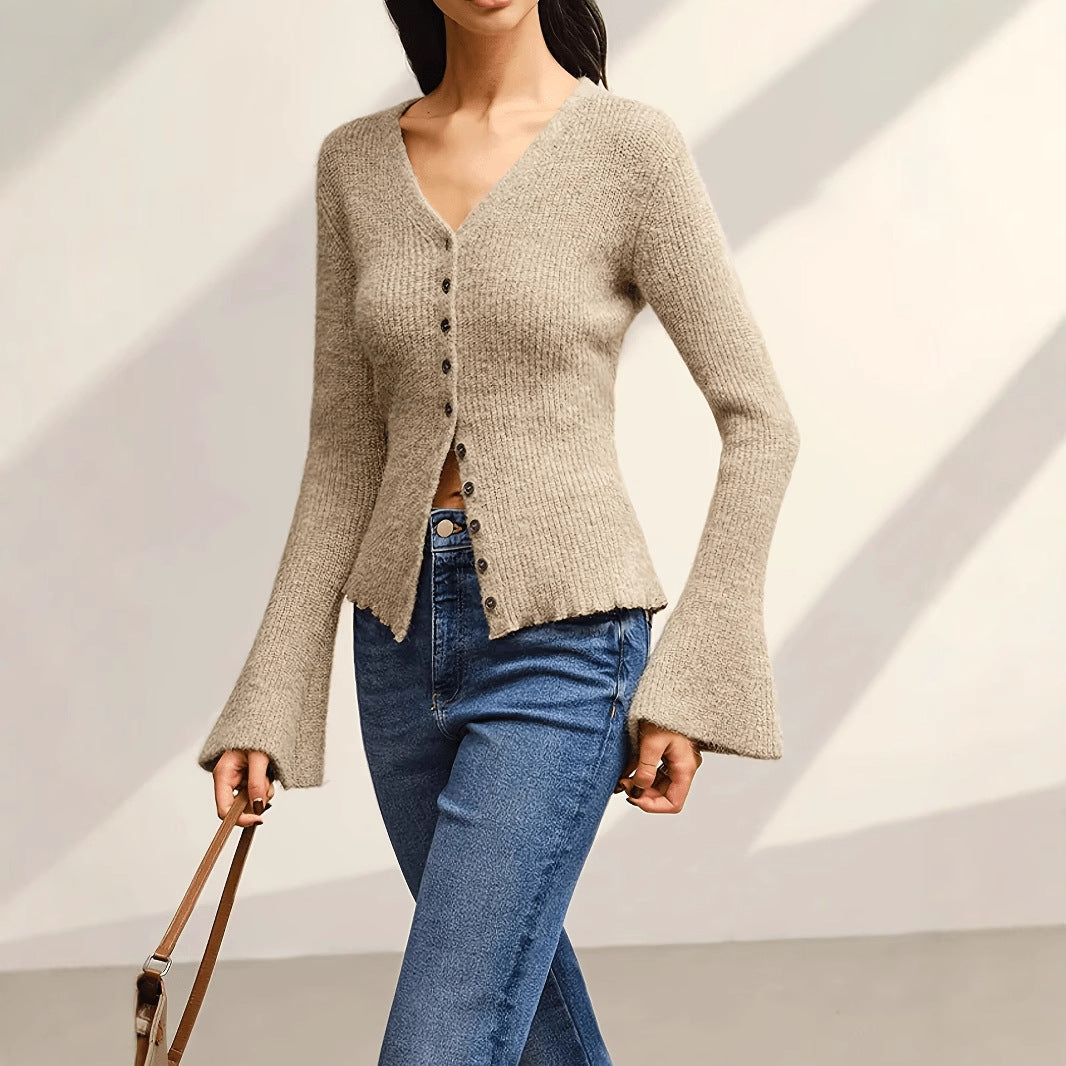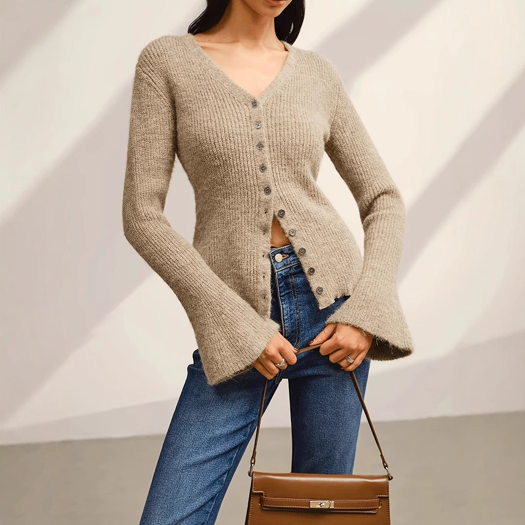 Con una silueta entallada y femenina, este suéter incorpora un escote en V y un cierre frontal con botones que aporta un acabado elegante y actual. Las mangas largas y el diseño limpio crean una imagen equilibrada, ideal tanto para looks informales como para combinaciones más cuidadas.